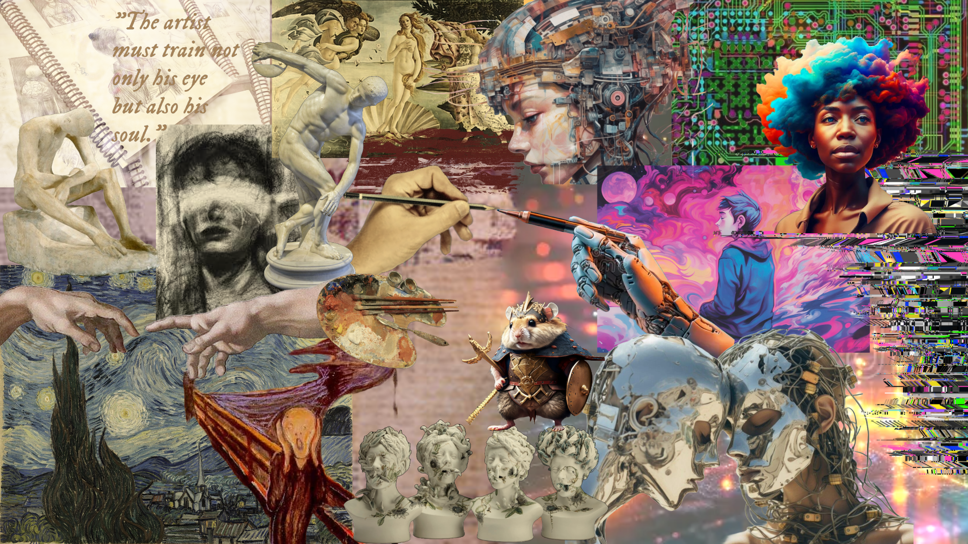 Highlights the contrast between traditional, historical art and futuristic digital art, with the human and robot hands connecting pencils to show how different styles can come together to create something greater.